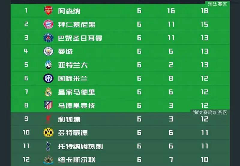 本赛季欧冠赛事进入第六轮后,英超球队的整体表现相当亮眼。阿森纳以全胜战绩稳居小组榜首,曼城位列第四,两队皆已提前两轮锁定晋级资格,至少确保了附加赛席位。紧随其后的利物浦、热刺、纽卡斯尔和切尔西虽未进入前八,但排名均在第9至13名之间,显示出强劲的整体实力。